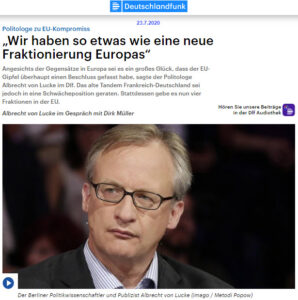 Neben den finanziellen Fragen sei die eigentliche große Frage, wo das verbindende europäische Gemeinsame sei, sagte der Berliner Politikwissenschaftler Professor Albrecht von Lucke im Deutschlandfunk. Jenseits der Tatsache, dass die EU erhalten bleiben solle, sei dieses Gemeinsame nicht sonderlich erkennbar gewesen. „Das ist das eigentliche Problem“, so von Lucke, der auch Redakteur bei den Blättern für die deutsche und internationale Politik ist.