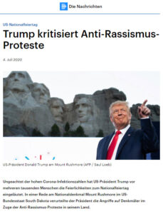 … die Statuen der US-Gründerväter zu Fall zu bringen. Das „stolze und starke amerikanische Volk“ werde aber nicht erlauben, ihm seine Geschichte und Kultur zu nehmen. Trump sprach von einer „gnadenlosen Kampagne zur Auslöschung unserer Geschichte.“ Unter dem „Banner der sozialen Gerechtigkeit“ werde versucht, sowohl die Gerechtigkeit als auch die Gesellschaft zu zerstören. Aus den USA solle ein Ort der „Unterdrückung, Herrschaft und Ausgrenzung“ gemacht werden. Das werde man nicht zulassen. Die USA seien das gerechteste und außerordentlichste Land, das jemals auf der Erde existiert habe.