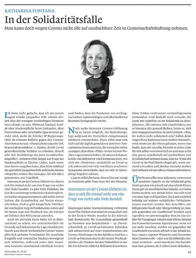 Heute füge ich einen bemerkenswerten Artikel der Schweizer Weltwoche(35/2020) bei. Es geht um Corona in der Schweiz. Alle Rechte liegen selbstverständlich bei der Weltwoche, deren Abonnement ich wärmstens empfehle.