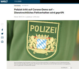 Nach der Rede eines Polizisten auf einer Corona-Demonstration in Augsburg wird ein dienstrechtliches Fehlverhalten des Beamten geprüft. Die Polizei habe Videoaufnahmen der Demonstration sichergestellt, die nun gesichtet und bewertet werden, sagte ein Sprecher des Polizeipräsidiums Mittelfranken am Montag. Während der Prüfung werde der Beamte nicht mehr als Führungskraft oder im Dienst mit Bürgerkontakt eingesetzt. Der Bayerische Rundfunk (BR) berichtete zuerst über den Fall.