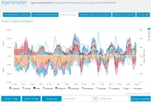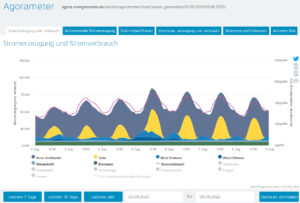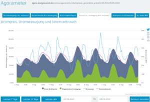 - Die braune Linie signalisiert den Strom, der noch zusätzlich erzeugt werden müsste, um den Bedarf zu decken.