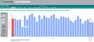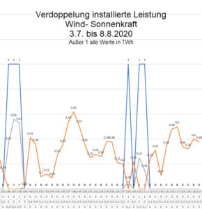 - Die blaue Linie zeigt mit der 1 an, dass der durch erneuerbare Energieträger erzeugt Strom ausreichen würde, wenn die aktuell installierte Leistung Wind- und Sonnenkraft verdoppelt würde.