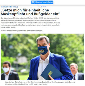 … „Wir haben nach wie vor unglaublich viele, tolle, vernünftige Menschen, die in einer bewundernswerten Weise für sich und andere vorsorgen“, sagte Markus Söder im Deutschlandfunk, aber es gebe auch eine Zahl von Menschen, die das nicht ernst nähmen „und deswegen muss man auch manchmal die Vernünftigen vor den Unvernünftigen schützen“.