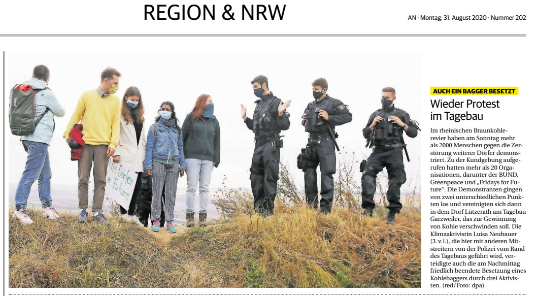 Erkelenz (dpa) – Braunkohlegegner haben am Sonntag einen Kohlebagger im rheinischen Tagebau Garzweiler besetzt. Die Klimaaktivistin Luisa Neubauer, die sich vor Ort an einer Kundgebung beteiligte, verteidigte die Aktion. Die Ungerechtigkeit sei hier so groß, dass man sich dagegen wehren müsse, sagte sie der Deutschen Presse-Agentur. Am Nachmittag beendete die Polizei die Aktion.