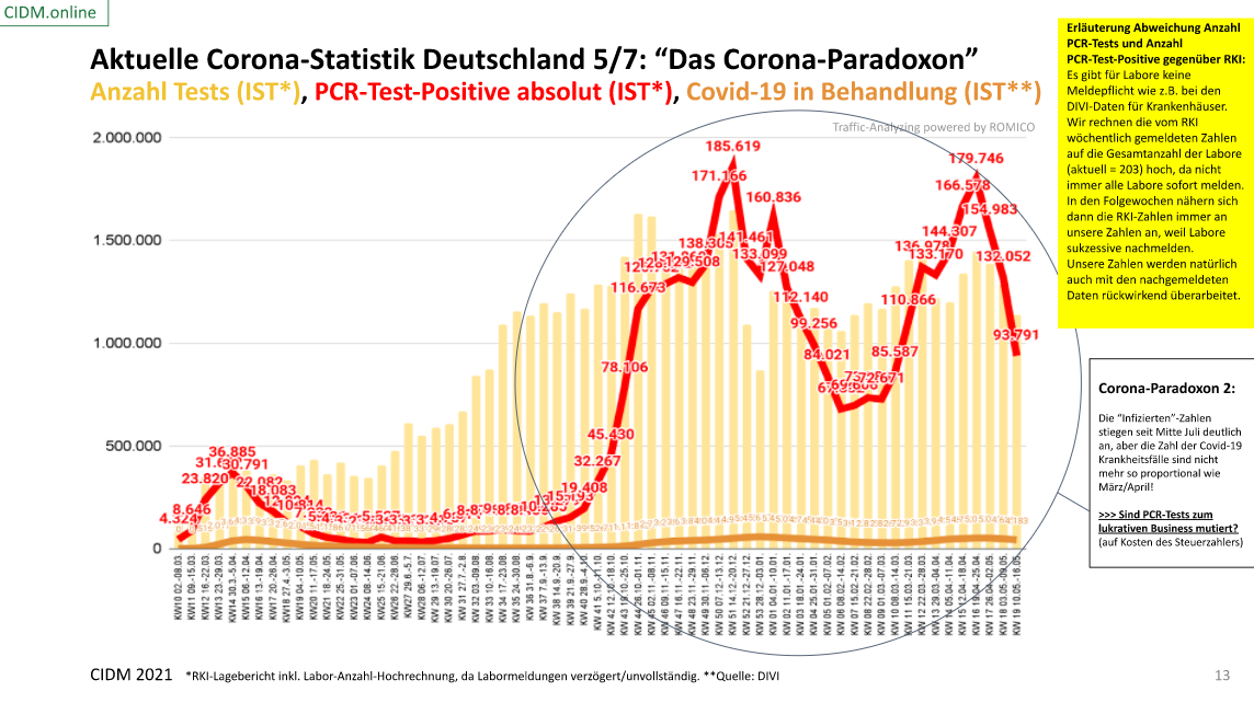 Das muß man sich auf der Zunge zergehen lassen, die Krankheitsfälle bei Covid 19 nehmen ab, die Intensivbetten sind mit Covid-19 Erkrankten so gut wie nicht mehr belegt, Sars.Cov-2 kann nicht mehr nachgewiesen werden, und nun müssen harte Maßnahmen ergriffen werden. Ich erinnere nochmals an den Vortrag von Prof. Bhakdi, indem er ausführt: In der Bevölkerung gibt es eine Grundimmunität. 80 % der Bevölkerung sind davon betroffen, was auch in den Studien aus USA und Tübingen bestätigt wurde. Die Erhöhung des Testaufkommens ist der Grund für erhöhte Infektionszahlen. Laut RKI wurden in KW 30 ca 563.553 Testungen vorgenommen, davon waren 4.364 positiv, entspricht einer Rate von 0,8. Das entspricht in etwa der Falschpositivrate von ca. 1 %, die bei Testungen anfällt.