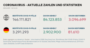Etwa 3.606.800 aktive Fälle (RKI-Dashboard) entsprechen 4,35% der Bevölkerung (83.000.000)