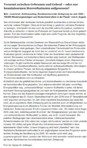 Zeitsprung: 2040, alle Kohlekraftwerke sind demontiert und ins Ausland verkauft. Ein tieffrequentes Brummen erfüllt nun bundesweit die Luft. 160.000 Windenergieanlagen -bis zu 310 m hoch und zumeist Made-in-China- stehen im Lande. Um Platz für horizontweite Fotovoltaikanlagen und Plantagen für Energiepflanzen zu schaffen, wurden in Ostdeutschland ganze Landstriche evakuiert.