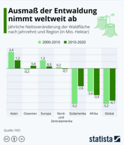 Die Grafik von Statista zeigt, dass Afrika mit 3,9 Millionen Hektar weltweit die höchste Nettoverlustquote an Waldfläche aufweist, gefolgt von den amerikanischen Kontinenten. Asien, Ozeanien und Europa konnten von 2010 bis 2020 mehr Fläche aufforsten als entwalden und verzeichnen einen Nettozuwachs, auch wenn dieser bei Europa und Asien geringer ausfällt als im vorherigen Jahrzehnt.