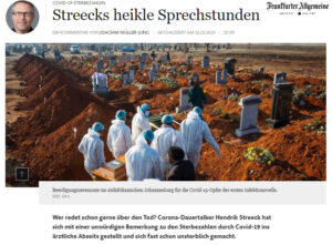 […] Die Selbstdisziplin, die das vom Arzt verlangt, droht allerdings durch deren Sprechstunden im Fernsehen heute leicht verlorenzugehen. Was dann auf prekäre Weise sichtbar werden kann, wenn etwa im Glanz der Öffentlichkeit das Wort zur Selbstentblößung verhilft. So geschehen mit dem als Anti-Drosten gehandelten und wahlweise als Arzt, Virologe, politischer Gewährsmann oder als Tröster libertärer Corona-Seelen gebuchten Talkshow-Dauergast Hendrik Streeck. Bei „Maischberger“ hat er sich jetzt mit einer, humanistisch betrachtet, geradezu frivolen Bemerkung wieder ins Rampenlicht gerückt: „Ich finde es müßig, über Todesfälle zu reden.“