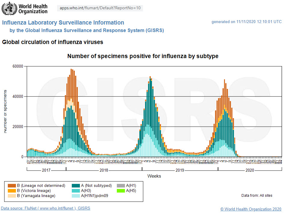 In diesem Betrag möchte ich mich einer vergessenen Krankheit widmen, der Grippe, verbunden mit einem optimistischen Ausblick. Ein Kollege hat mich auf die WHO-FluMart aufmerksam gemacht. Sie finden auf dieser offiziellen WHO-Seite eine weltweite Influenza-Erhebung bezüglich der Grippehäufigkeit. Eine Standardisierungsplattform vieler Quellen, Labore, nationale Erhebungen etc. zum Thema Grippe. Wie man sich das vorstellen muss, zeigt diese Grafik. Dort ist die Influenza ab Frühjahr dieses Jahres einfach verschwunden. Dies war in keinem der vorangehenden Jahre der Fall. Die Influenza überlebt auf niedrigem Niveau im Sommer, um dann meist im Herbst wieder anzusteigen.