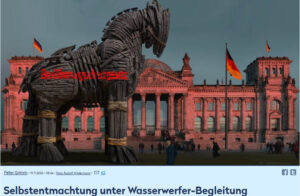 … Er kann jetzt beispielsweise theoretisch die Bewegungsfreiheit der Bürger mittels Reiseverboten, Grenzschließungen oder Ausgangssperren einschränken. Nur durch ministerielle Anordnung könnte also mal Landesarrest und mal Hausarrest verhängt werden, es muss nur irgendwie mit dem Corona-Virus zu tun haben. Auch Kontaktverbote, Geschäftsschließungen, die zwangsweise Stilllegung des gesamten Kulturbetriebs und andere Restriktionen aus dem inzwischen ja hinlänglich bekannten Ausnahmezustands-Instrumentarium, können auf der Grundlage einer einfachen Regierungs-Verordnung verhängt werden. Die Parlamente in Bund und Ländern müssen nicht mehr gefragt werden, dieser Entmachtung haben Bundestag und Bundesrat mehrheitlich zugestimmt, indem sie die Regierungen zu derartigen Maßnahmen ermächtigt haben.