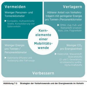 - Pkw-Bestand in Städten auf 1/3 des heutigen Wertes senken. Dafür Ausbau der Rad- und Fußinfrastruktur und des ÖPNVs, kombiniert mit Push-Faktoren wie City-Maut, Tempolimits und Reduzierung von Fahrspuren und Parkplätzen