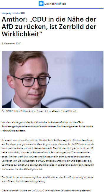Er sprach von einem Zerrbild der Wirklichkeit. Amthor sagte im Deutschlandfunk, auf Bundesebene gebe es eine klare Abgrenzung, die sowohl die CDU-Vorsitzende Kramp-Karrenbauer als auch Generalsekretär Ziemiak deutlich gemacht hätten. Er sehe auch nicht, dass es in Sachsen-Anhalt Bestrebungen zur Zusammenarbeit gebe. Amthor warf SPD, Grünen und Linkspartei in dem Bundesland taktisches Verhalten vor. Sie versuchten, der CDU etwas zu unterstellen und diese über die Sachfrage zur Erhöhung des Rundfunkbeitrags in Bedrängnis zu bringen. Dadurch werde aber nur die AfD aufgewertet.