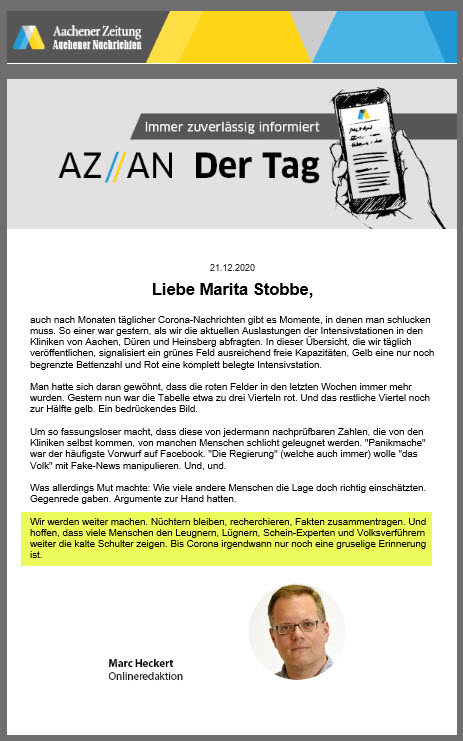 bitte unterlassen Sie es, die Afd in Verbindung mit irgendwelchem Antisemitismus in Verbindung zu bringen. Das gleiche unterlassen Sie bitte bei Menschen – ich gehöre zu Ihnen – , die gegen die offizielle Linie der Corona-Bekämpfung sind. Ich kann verstehen, dass Sie immer dann, wenn Nichtjuden Symbole des verwerflichen Umgangs der Nazis mit Juden wie z. B. den Judenstern, der bereits lange (1935) vor der systematischen Vernichtung von Juden in Deutschland (1942) eingeführt wurde, nutzen, um auf die Diskriminierung, die sie als „Leugner(n), Lügner(n), Schein-Experten und Volksverführer(n)“ erfahren, aufmerksam zu machen: