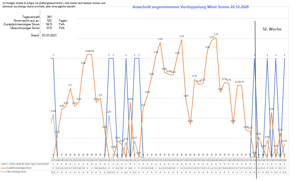 - Den kompletten Chart „Angenommene Verdoppelung Wind- und Sonnenstromerzeugung“ als Exceltabelle herunterladen: Hier klicken