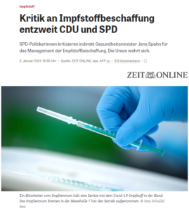 Das Possenspiel der Impfkampagne ist mal wieder höchst bemerkenswert. Der Sündenbock steht namentlich fest und heißt Spahn. Dazu gibt es jetzt anderslautende Zeitungsberichte, die da berichten, daß Herr Spahn auf Anweisung der Kanzlerin seinen eigenen Einkaufsplan begraben mußte. Dazu lieber Herr Spahn: Sie haben die Befugnisse durch die Änderungen des Infektionsschutzes erhalten und nicht Frau Merkel! Wer sich nicht behaupten kann, ist weder geeignet Parteivorsitzender zu werden und erst recht nicht Kanzlerkandidat. Am besten treten sie zurück, am besten mit Frau Merkel gemeinsam, damit dann wieder Realpolitik in diesem Land möglich wird!!!
