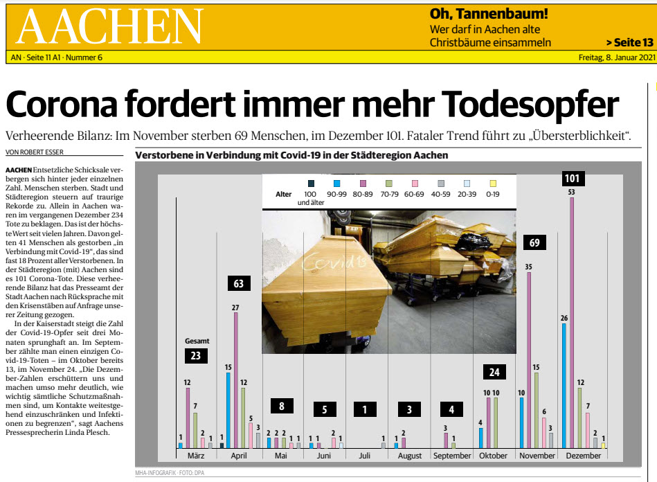 Ja, das ist so. Menschen sterben. Nicht nur an oder mit Corona. Die meisten sterben an anderen Erkrankungen. Mein Vater ist z. B. praktisch 5 Jahre lang an Blutkrebs gestorben. Er sah – als er dann endlich sterben durfte – wie ein KZ-Insasse aus. Ausgemergelt bis auf die Knochen von Bestrahlungs- und Chemotherapie. Ich weiß, was ein entsetzliches Schicksal ist. Diese Schicksale gab es vor Corona, die wird es nach Corona geben. Und nicht nur wegen Corona. Dieses Herausheben einer in der Städteregion ziemlich geringen Todesursache, das Hervorheben eines, zweier Monate, damit die Corona-Zahlen wenigstens etwas Fleisch bekommen, das ist keine solide journalistische Arbeit, sondern Interesse geleitetes Politbürogeschreibsel. Das Interesse besteht darin, die Menschen auf Maßnahmen-Linie zu halten, sie sollen froh sein, dass der Staat es richtet und gefälligst ruhig sein und am besten immer die Maske, den Maulkorb tragen.