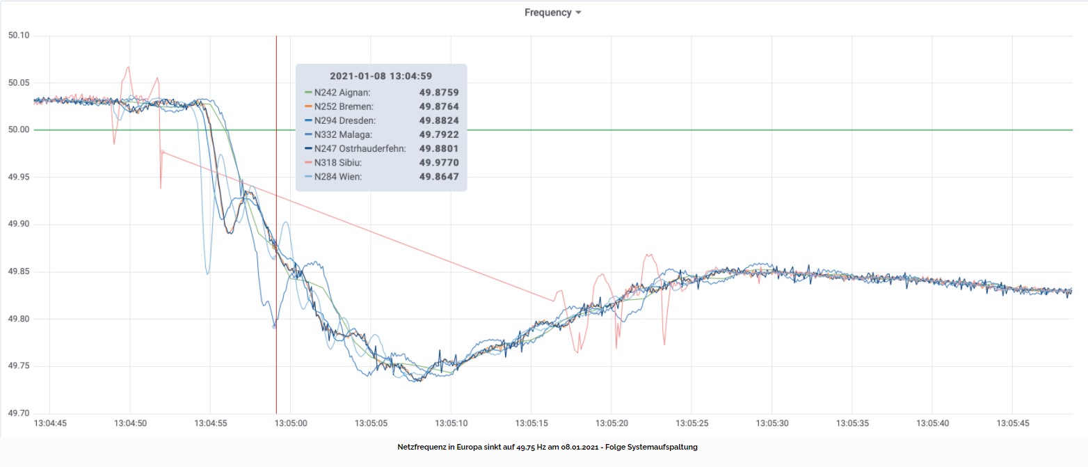 Zu diesem Zeitpunkt kam es im europäischen Höchstspannungsnetz (ENTSO-E) zu einem deutlichen Frequenzeinbruch. Innerhalb von 14 Sekunden erfolgte ein Frequenzabfall von 50,027 auf 49,742 Hertz.