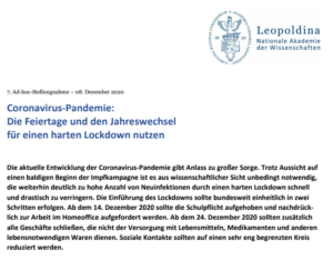 Mit größtem Erstaunen, mit tiefster Sorge, ja Fassungslosigkeit habe ich die „7. ad hoc Stellungnahme“ der Nationalen Akademie der Wissenschaften Leopoldina vom 8.12.2020 zur Kenntnis genommen.