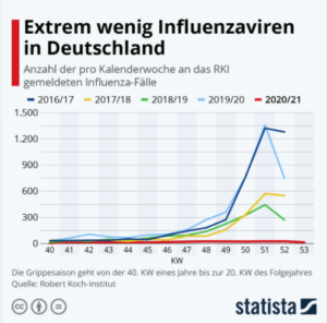 […] „Weltweit berichten Länder über eine niedrige Influenza-Aktivität, die deutlich unter den Ergebnissen im vergleichbaren Zeitraum der Vorjahre liegt.“ Eine konkrete Begründung liefert das RKI nicht. Aber es ist denkbar, dass die aktuellen Maßnahmen zur Eindämmung der Corona-Pandemie auch die Verbreitung der Influenzaviren bremsen. […]