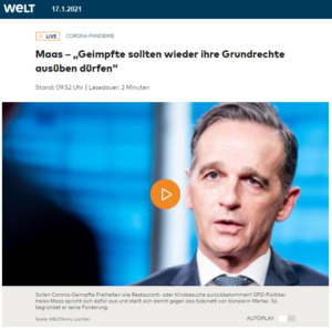 Maas erinnerte auch an die Betreiber von derzeit geschlossenen Restaurants, Kinos, Theater oder Museen. „Die haben ein Recht darauf, ihre Betriebe irgendwann wieder zu öffnen, wenn es dafür eine Möglichkeit gibt. Und die gibt es, wenn immer mehr Menschen geimpft sind. Denn wenn erst mal nur Geimpfte im Restaurant oder Kino sind, können die sich nicht mehr gegenseitig gefährden.“
