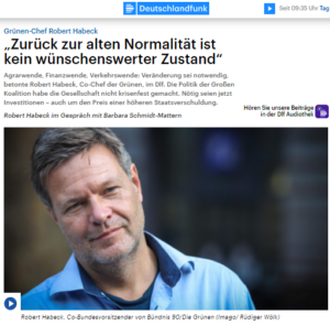 Agrarwende, Finanzwende, Verkehrswende: Veränderung sei notwendig, betonte Robert Habeck, Co-Chef der Grünen, im Dlf. Die Politik der Großen Koalition habe die Gesellschaft nicht krisenfest gemacht. Nötig seien jetzt Investitionen – auch um den Preis einer höheren Staatsverschuldung.