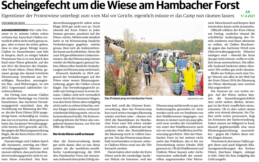 Denn gemäß Bericht der AN hat das ´Gericht in letzter Instanz bestätigt, dass die Wiese am Hambacher Forst geräumt werden darf.`