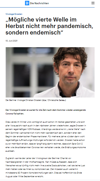 Dies werde im Winter und womöglich auch schon im Herbst geschehen und sich aller Voraussicht nach auch in den nächsten Jahren wiederholen, sagte Drosten in seinem regelmäßigen NDR-Podcast. Allerdings werde eine Art „vierte Welle“ nach dem Sommer wahrscheinlich nicht mehr pandemisch sein, sondern eher den Beginn der endemischen Phase markieren. Für mehrere Jahre würden dann wohl regelmäßige Auffrischungs-Impfungen erforderlich werden. Drosten hatte schon zuvor mehrfach erklärt, dass er langfristig damit rechnet, dass sich Sars-CoV-2 eher wie die altbekannten Coronaviren verhalten werde, die Erkältungssymptome auslösen.