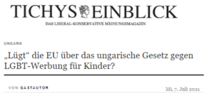 Daher sei die Verlautbarung der Präsidentin der Europäischen Kommission eine „Verleumdung“. Denn es sei leichter, „die Leute über die ungarische Regierung wütend zu machen, wenn die EU-Kommission sie davon überzeugt, dass das ungarische Gesetz auf die Unterdrückung aller Homosexuellen und Transgender generell als auf eine an Kinder gerichtete Werbung abzielt“. Von der Leyen sage mit ihrem Statement indirekt aus, dass die Verteidigung von Drag Queen-Vorlesestunden für Kindergartenkinder eine Sache „fundamentaler Menschenrechte“ sei, aber nicht das Elternrecht, ihre Kinder vor dieser Art von Werbung für Homosexualität und Transgenderismus zu schützen.