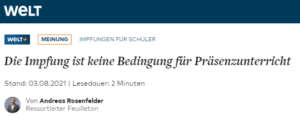 *Weil der Artikel und die Meinung außerordentlich wichtig für die Fragestellung „Corona-Impfung und Schule?“ sind, zitieren wir den Text. Verweise, Grafiken und Kommentare lesen Sie, wenn Sie WELTplus testen/abonnieren. Wir empfehlen WELTplus ausdrücklich: 30 Tage kostenlos testen.