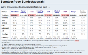 Das Affentheater mit der Sonntagsfrage Bundestagswahl ist nur noch lächerlich! Das sind keine repräsentativen Umfragen sondern ein Gemisch aus Manipulation und Zeitgeist. Ich hatte schon vorab dazu geäussert, dass 3 Monate vor der Wahl solche Umfragen untersagt werden müssten!