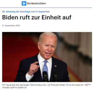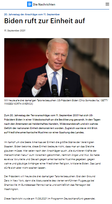 Zum 20. Jahrestag der Terroranschläge vom 11. September 2001 hat sich US-Präsident Biden in einer Videobotschaft an die Bevölkerung gewandt. In den Tagen nach den Attentaten sei heldenhaftes Handeln, Widerstandskraft und ein wahres Gefühl der nationalen Einheit demonstriert worden. Zugleich warnte er mit Blick auf friedliche amerikanische Muslime vor einer Spaltung des Landes.