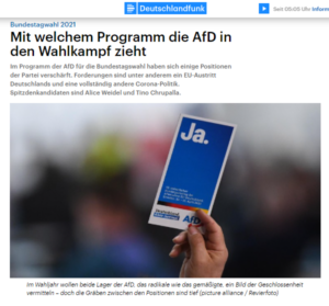 Wie unsäglich der Dlf über die AfD berichtet, zeigt das folgende Feature vom 6.9.2021. Da wird als „Höhepunkt“ sogar ein Bezug zwischen der Ermordung Walter Lübkes und derAfD hergestellt:
