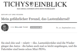 … Ich trat auf die Straße … und um ein Haar hätte mich ein Lastenfahrrad überrollt. Es kam von links, gemäß einer Ausnahmeregel der Straßenverkehrsordnung selbstverständlich gegen die Einbahnstraßenrichtung. Denn es ist ein Fahrrad, die dürfen das und zwar gerne. Aber tatsächlich war ein schweres Gefährt des Logistik-Dienstleisters mit einem kastenförmigen Aufbau mit hohen Ladevolumen, 500 kg sollen es sein; plus Fahrer mit kräftigen Muskeln. 930 kg wiegt ein VW up; mit viel Sicherheitstechnik. Beide fahren in der Stadt ähnlich schnell. Denn natürlich hat das Lastenfahrrad einen elektrischen Antrieb, aber keinerlei Sicherheitstechnik. Es sah gefährlich aus; denn abstehende Stangen für Rückspiegel, der Lenker und anderen zerklüftete Bauteile hätten mit nach der Kollision aufspießen können.
