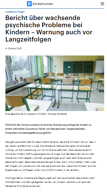 Die Politik der Corona-Lockdowns hat einer Auswertung zufolge bei Kindern zu einem weltweiten Zuwachs an Fällen von Depressionen, Angstzuständen, Einsamkeit und Selbstgefährdung geführt.