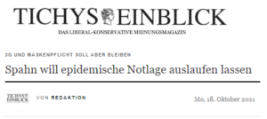 Mehr… Bundesgesundheitsminister Jens Spahn sprach sich in einer Konferenz der Gesundheitsminister der Länder dafür aus, die „epidemische Lage von nationaler Tragweite“ – Grundlage zahlreicher Corona-Maßnahmen – im November auslaufen zu lassen. Ein Bericht der Bild-Zeitung wurde mittlerweile aus dem Ministerium bestätigt. 3G-Maßnahmen und Maskenpflicht sollten nach Spahns Ideen allerdings beibehalten werden. Laut Bild-Zeitung sagte Spahn in der Konferenz: „Wir kommen vom Ausnahmezustand also in einen Zustand besonderer Vorsicht. Der Normalzustand wird aus heutiger Sicht erst im Frühjahr nächsten Jahres möglich sein.“