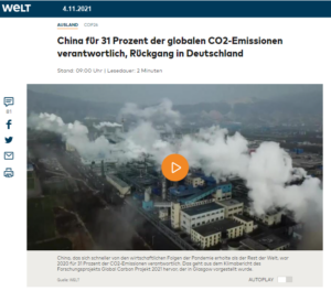China ist im vergangenen Jahr für 31 Prozent der weltweiten Treibhausgasemissionen verantwortlich gewesen. Das geht aus dem Klimabericht des Forschungsprojekts Global Carbon Projekt 2021 hervor, der am Donnerstag anlässlich der Weltklimakonferenz COP26 in Glasgow veröffentlicht wurde.