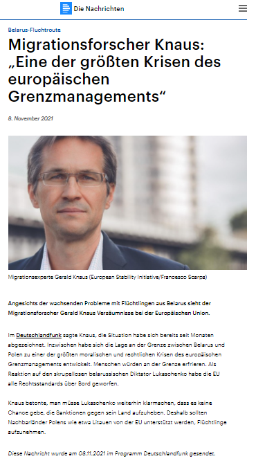 Im Deutschlandfunk sagte Knaus, die Situation habe sich bereits seit Monaten abgezeichnet. Inzwischen habe sich die Lage an der Grenze zwischen Belarus und Polen zu einer der größten moralischen und rechtlichen Krisen des europäischen Grenzmanagements entwickelt. Menschen würden an der Grenze erfrieren. Als Reaktion auf den skrupellosen belarussischen Diktator Lukaschenko habe die EU alle Rechtsstandards über Bord geworfen.