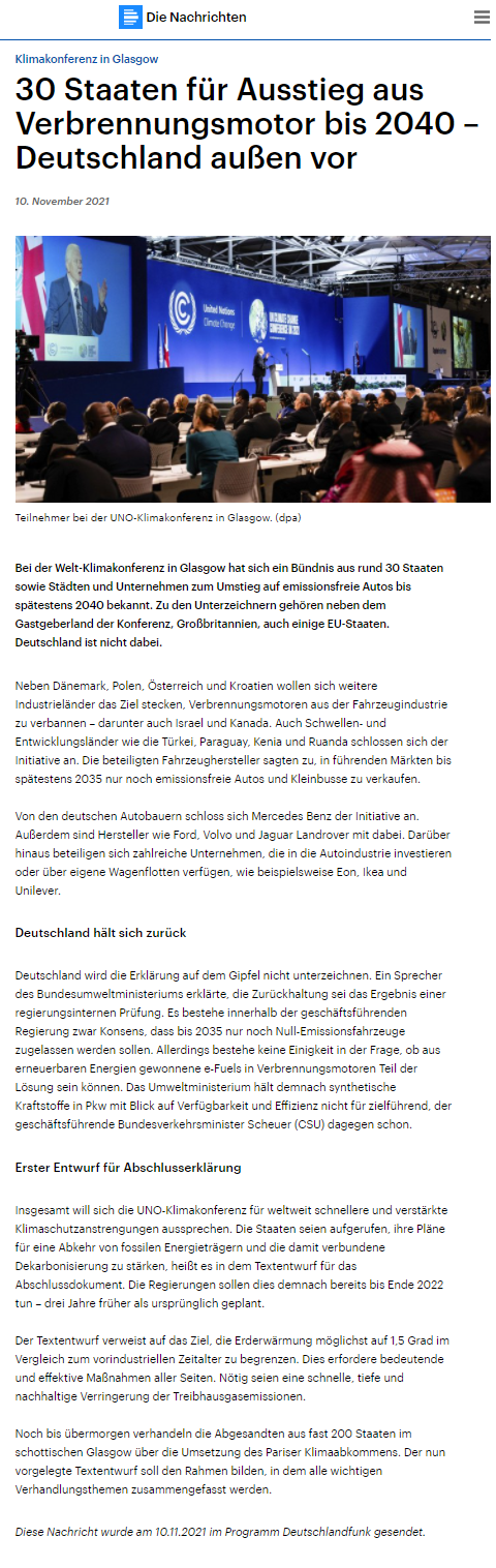 … hat sich ein Bündnis aus rund 30 Staaten sowie Städten und Unternehmen zum Umstieg auf emissionsfreie Autos bis spätestens 2040 bekannt. Zu den Unterzeichnern gehören neben dem Gastgeberland der Konferenz, Großbritannien, auch einige EU-Staaten. Deutschland ist nicht dabei.