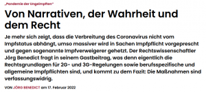 … Deutschlands bewegt sich das Land wieder mit ungeheurer Dynamik in einen autoritären Staat, der z. B. ungeimpft gesunde Menschen diskriminiert.