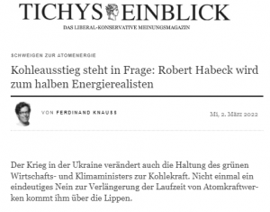 Mehr… ganz nebenbei eine grundlegende Revision der Energiewende in Aussicht gestellt. Womöglich werden Deutschlands Kohlekraftwerke nun doch nicht im Jahr 2030 endgültig erlöschen. Nach Brandenburgs Ministerpräsident Dietmar Woidke hat nun auch Bundeswirtschafts- und Klimaschutzminister Robert Habeck eine Verlängerung aufgrund des Krieges in der Ukraine in Aussicht gestellt. „Da muss der Pragmatismus jede politische Festlegung schlagen, die Versorgungssicherheit muss gewährleistet sein“, sagt der Grünen-Politiker am Mittwoch im Deutschlandfunk.