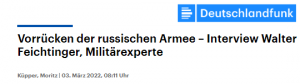 Ukraine: Analyse des Experten Feichtinger Vielleicht – hoffentlich* – ist die folgende Analyse ´überholt` https://www.mediagnose.de/wp-content/uploads/2022/03/Feichtinger_Ukraine_Dlf_03032022.mp3 * Weil der Krieg beendet wurde.