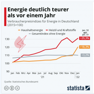 Die Verbraucherpreise für Haushaltsenergie, Heizöl und Kraftstoffe haben sich in den vergangenen Monaten deutlich verteuert. Das zeigt die Statista-Grafik auf Basis der neuesten Zahlen des Statistischen Bundesamtes. So legten die Preise für Haushaltsenergie binnen eines Jahres um 18 Prozent zu. Hierzu zählen die Preise für Strom, Gas und andere Brennstoffe. Die Preise für Heizöl und Kraftstoffe stiegen im selben Zeitraum sogar um 29 Prozent. Der Gesamtindex der Verbraucherpreise ohne Energie stieg dagegen lediglich um 3,2 Prozent.