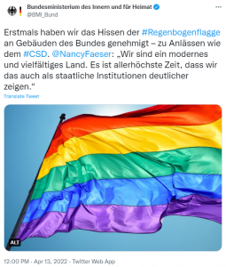 Weil Innenministerin Faeser entweder keine Ahnung hat, oder sie den Schwulen, Lesben und Di-, Per- oder sonstigen versen huldigen (auch eine Form des Stimmenfangs) will.