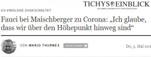 Corona aktuell: US-Präsidentenberater Fauci am 4.5.2022 bei Maischberger zugeschaltet Quelle Die Rezension bei Tichy: Quelle & Artikel Weitere Medien