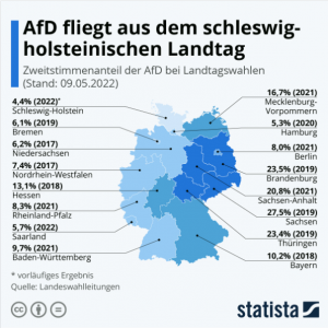 Verloren haben außerdem die FDP (-5,1 Prozentpunkte) und die AfD (-1,5 Prozentpunkte). Gestern machten nur 4,4 Prozent der Wählenden ihr Kreuz bei den Rechtspopulisten, die damit im kommenden Landtag nicht mehr vertreten sein wird. Zuvor hatte die AfD bei den Landtagswahlen in Berlin und Mecklenburg-Vorpommern teilweise empfindliche Verluste hinnehmen müssen, wie diese Statista-Grafik zeigt.