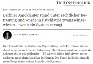 Verwerflich allerdings ist das Ausschlachten einer solchen Tat, wenn der politische Hintergrund vermeintlich stimmt. Bestes Beispiel ist die Tat des ebenfalls psychisch kranken Täters von Hanau. ´Hanau` ist in den Erzählungen des Rassismus der rechtsextremen Gewalt in Deutschland ein Leuchtturm. Tunlichst verschwiegen wird aller meistens, dass der Täter wohl alleine aus seiner krankheitsbedingten kruden Welt handelte. Dass durch die – grauenhafte – Tat also keinerlei wirkliche Gefahr für den demokratischen Staat Deutschland ausging.