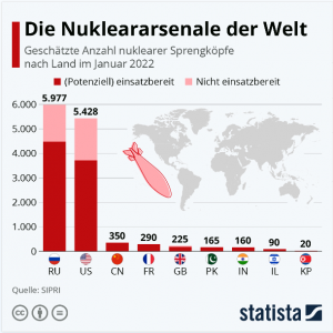 Im Vergleich zum Vorjahr bleibt die Anzahl der atomaren Sprengköpfe weltweit weitestgehend stabil, die Nuklearmächte Russland und USA haben teilweise deutlich abgerüstet. Das geht aus Daten des Friedensforschungsinstituts SIPRI hervor. Statt der im Januar 2021 veranschlagten 6.255 Sprengköpfe besitzt Russland laut SIPRI-Schätzungen beispielsweise nur noch 5.977, wovon 1.500 nicht einsatzbereit sind. Wie unsere Grafik zeigt, gibt es weltweit noch zwei weitere Atommächte mit Nuklearwaffen, die derzeit nicht nutzbar sind oder darauf warten, vollständig abgerüstet zu werden. …