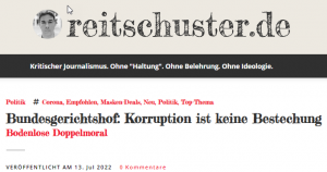 … wundern oder ärgern, lassen Sie mich erklären, wie ich zu ihr komme. Tatsächlich könnten Sie einwenden, wenn ein Gericht in letzter Instanz entscheidet dass eine umstrittene Handlung keine Bestechung ist, dann ist sie auch keine Korruption. In der Tat. In seiner Entscheidung, in welcher der Bundesgerichtshof jetzt die so genannten „Maskendeals“ legalisierte, schreiben die Richter: Allein die Tatsache, dass sich ein Mandatsträger „bei außerparlamentarischen Betätigungen auf seinen Status beruft, um im Interesse eines Privatunternehmers Behördenentscheidungen zu beeinflussen“, erfülle nicht das Merkmal der Bestechlichkeit. …