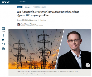 Für den aktuellen Zustand mag das zutreffen, denn russisches Gas ist ein wesentlicher Faktor bei der Wärmeerzeugung. Doch das wird sich in naher Zukunft ändern. Wärme soll nach Vorstellungen der Bundesregierung und insbesondere der Grünen künftig aus Strom hergestellt werden.